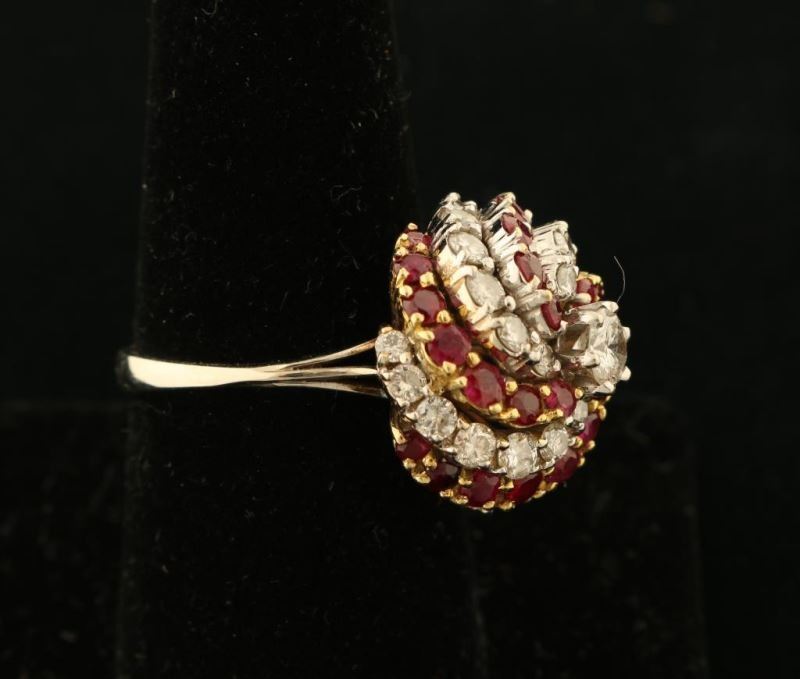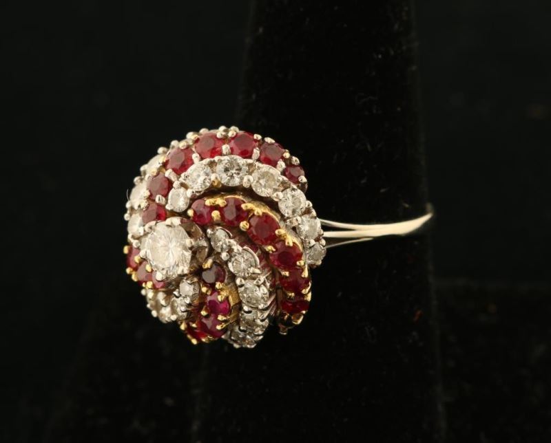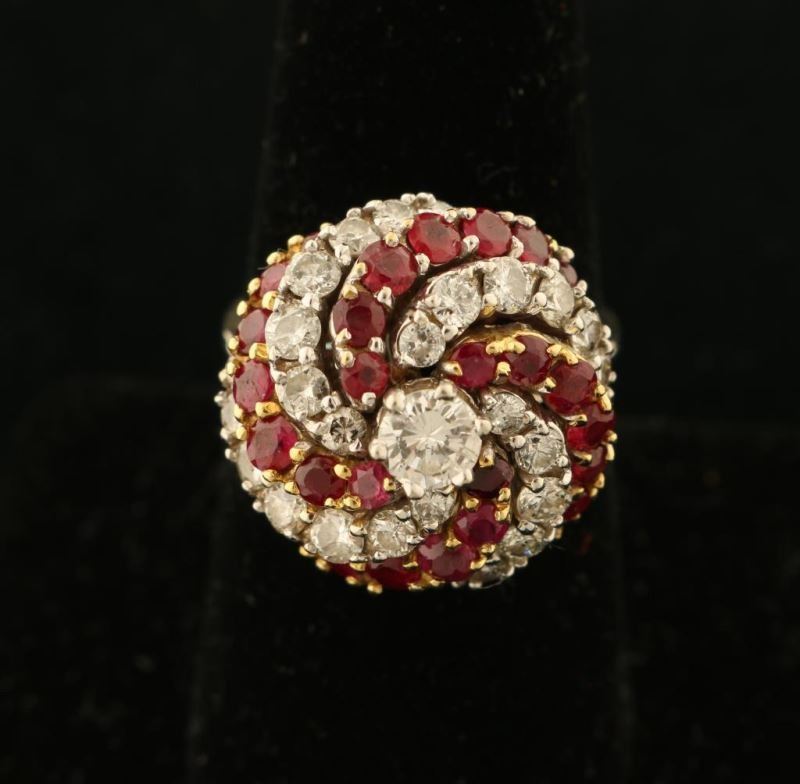 Spiral motif one diamond solitaire in the middle with 28 spiraling diamonds 1.40cts. and 28 rubies 2.22cts. set in 18kt white gold. Includes appraisal from Roberts Auction Galleries shows a value of 3000.00.