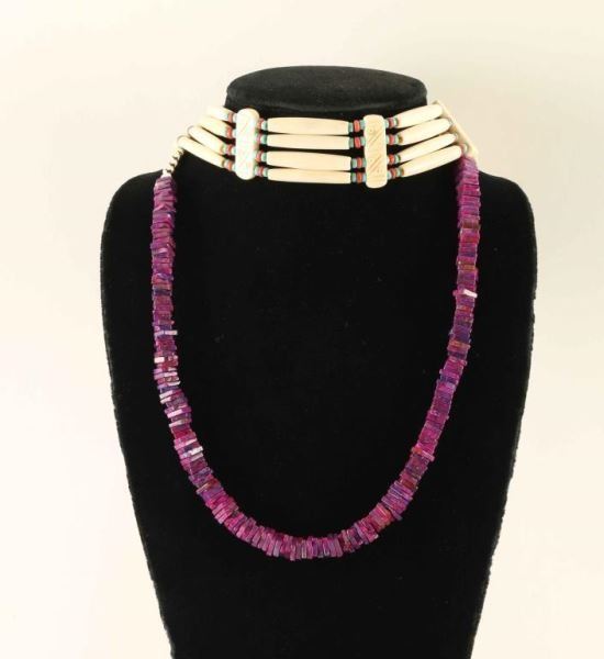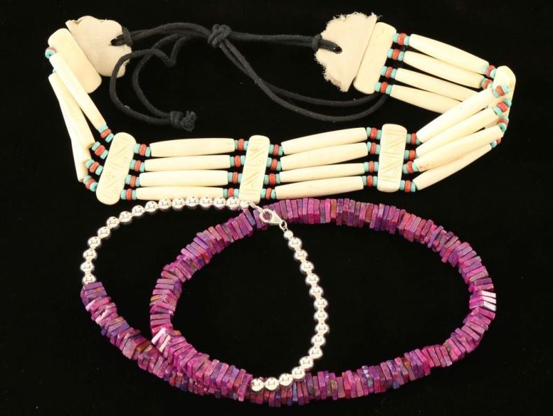 (1) Purple turquoise Navajo necklace with a traditional pueblo style pattern of enhanced square beads. Sterling pearl beads and a lobster clasp finish the necklace, about 24" long. Designed and strung by Navajo Mark Kasuse. (1) Four strand bone choker with turquoise and apple coral wheel beads held in place by etched slabs. About 1 1/8" tall and about 14" from tab to tab the leather ties add about 6" on each end.
