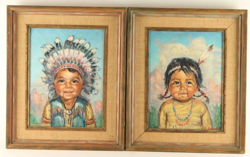 by Doris Wood Robinson, one of a smiling Native American girl, the other of a boy wearing a feather headdress with desert landscapes in the background. Signed lower right. Images measure 15 1/2"x11 1/2" in wood frames with burlap insets.