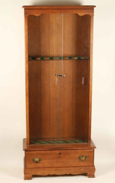 Wood cabinet holds 6 rifles with glass front and lower gallery drawer.