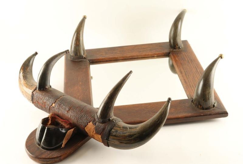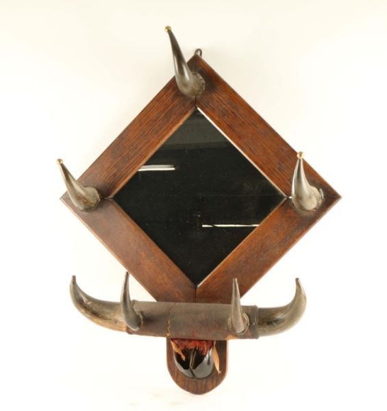 Oak framed mirror accented with buffalo horns for hanging hats and coats. Shows age. Measures 33" x 25".