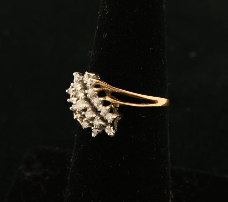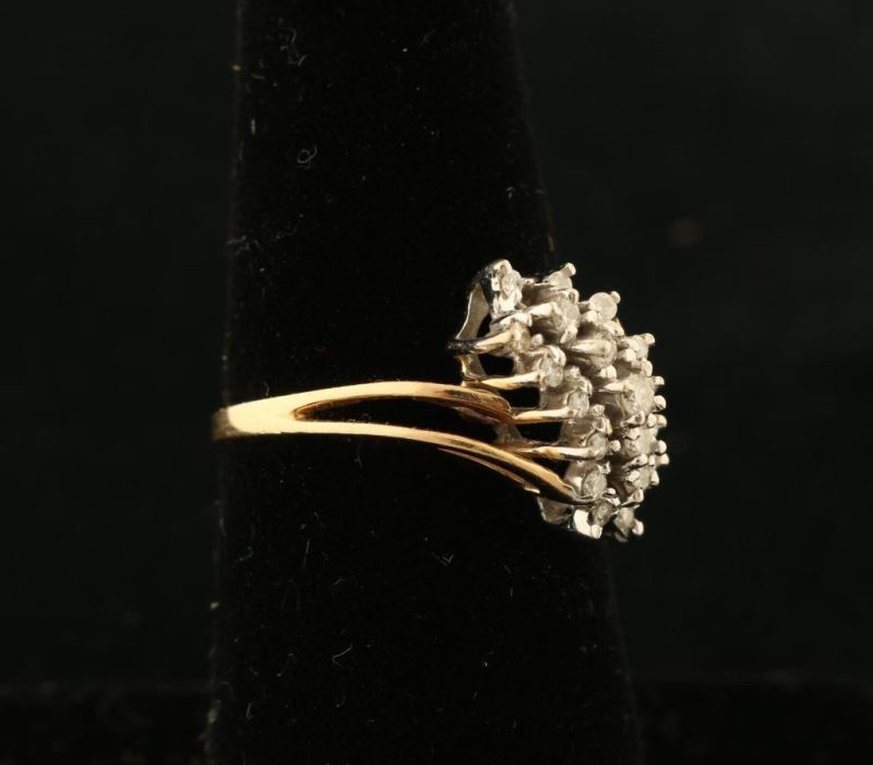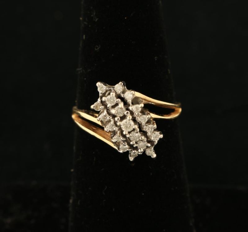 Small diagonal cluster of Moissanite stones set in 14K yellow gold