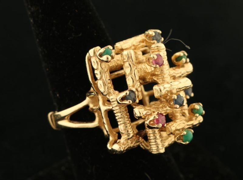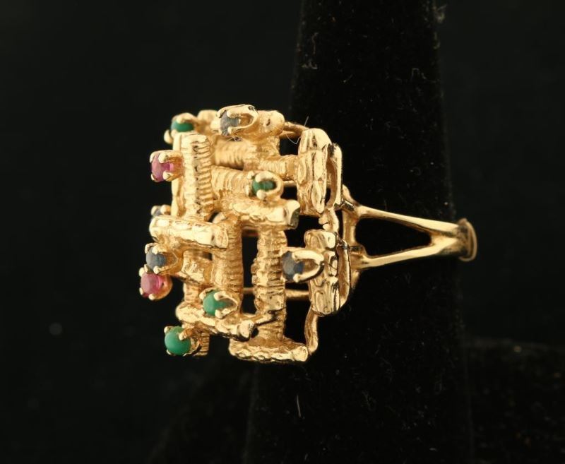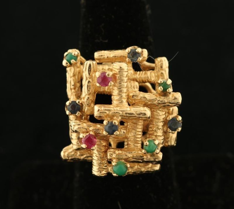 14K gold with an open basketweave design set with small ruby, emerald and sapphire stones. Ring has an interesting three dimensional style.