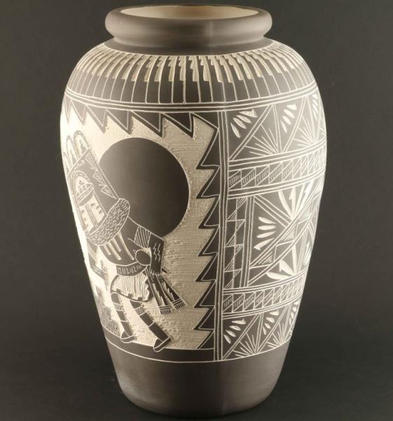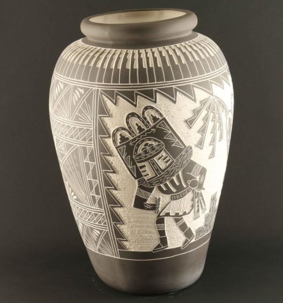 Tall Acoma Vase with incised carved design of Kachina and geometric motif. Signed Romero. Measures 17"x10"