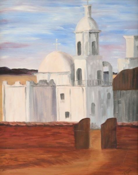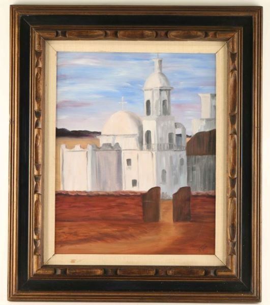 "White Dove of the Desert" by Norma J. Tyra, signed lower right. Image measures 19 1/2"x15 1/2" in carved wood frame with linen inset.