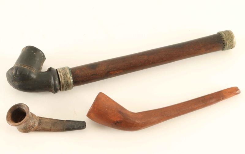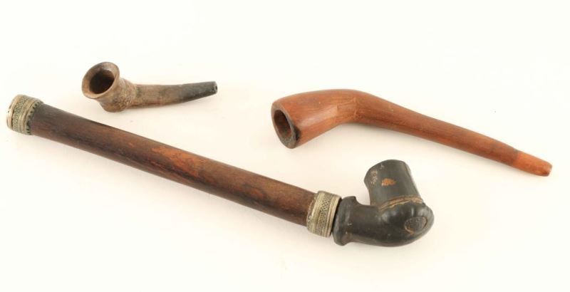 Including; (1) Small clay pipe measures 1"x3". (1) Prehistoric Mound Builder red clay pipe measures 6 1/4" x 1 1/8". (1) Pipe with black clay bowl with wooden stem with two metal rings around stem. Measures 2" x 9 1/2".