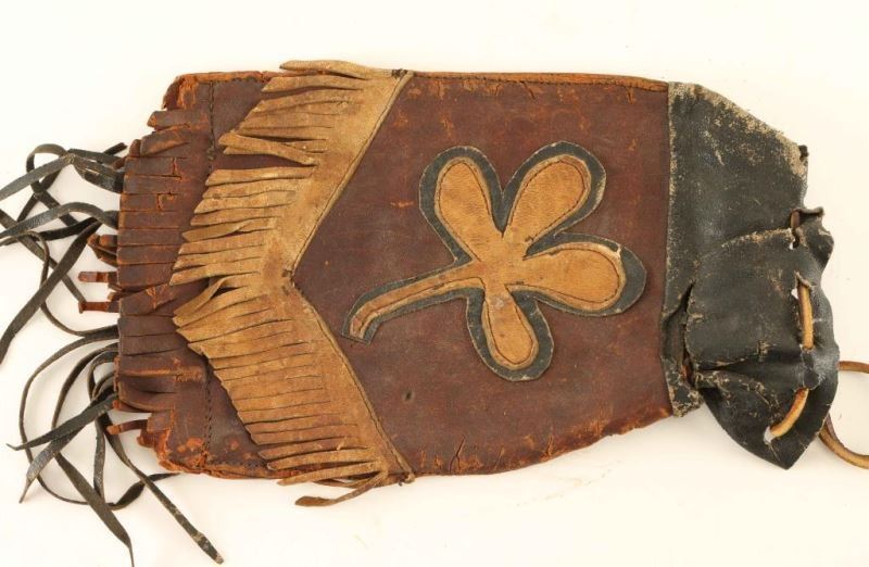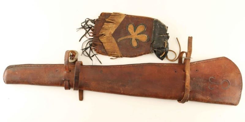 Includes a leather rifle scabbard which has a 0-3 brand and a fringed leather pouch with four leaf clover.