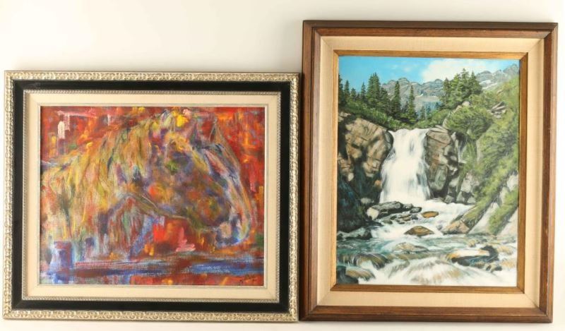 Original oil by Julie Gissler Barry "Painted Horses" signed lower right in molded silver frame with black and linen inset. Image measures 15 1/4"x19 1/4". Original Acrylic of waterfall by Francis Currie in wood frame with linen and wood inset, signed lower right. Image measures 19 1/2"x15 1/2".