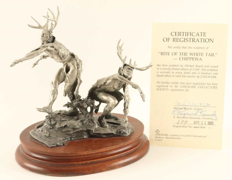 #699/2500 1983 by Michael Boyett entitled "Rite of the White Tail-Chippewa". Measures 8"x51/2"X7". Includes certificate of registration