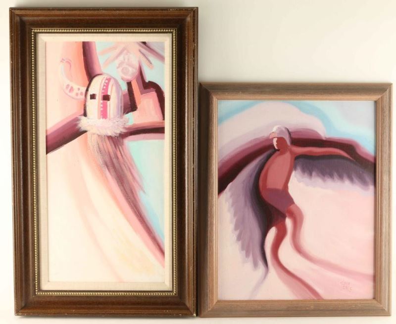 All by John Jones. (1) Oil on canvas board of warrior on horse back, signed lower right, image measures 17 1/2" x 23 1/2" in wood frame with linen inset. (1) Oil on canvas board of Eagle Dancer, signed lower right. Image measures 19 1/2" x 15 1/2" in wood frame. (1) Oil on canvas of Kachina, signed lower right. Image measures 23 1/2" x 11 1/2" in wood frame with linen inset.