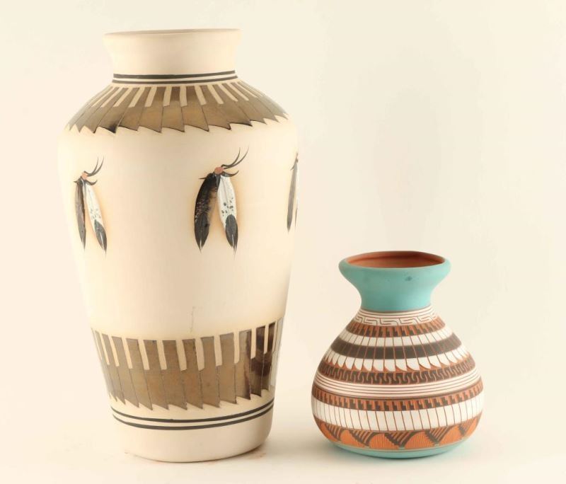 Vase with feather design by Marilyn measures 14"x8" and one incised carved pot by Verna & Jeff Begay measures 7"x5'".