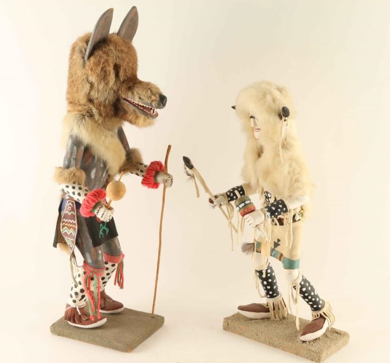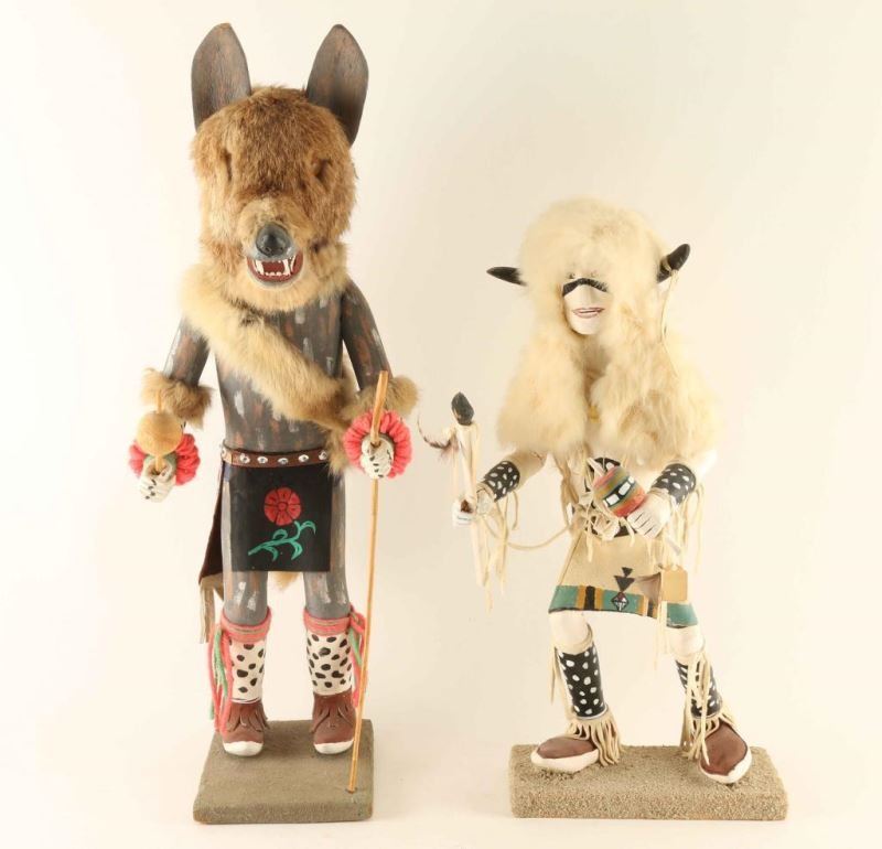 Wolf Dancer signed 'Rose Lanempn' measures 23"x5" and a Hopi White Buffalo Dancer measures 18"x9" unsigned hand is damaged.
