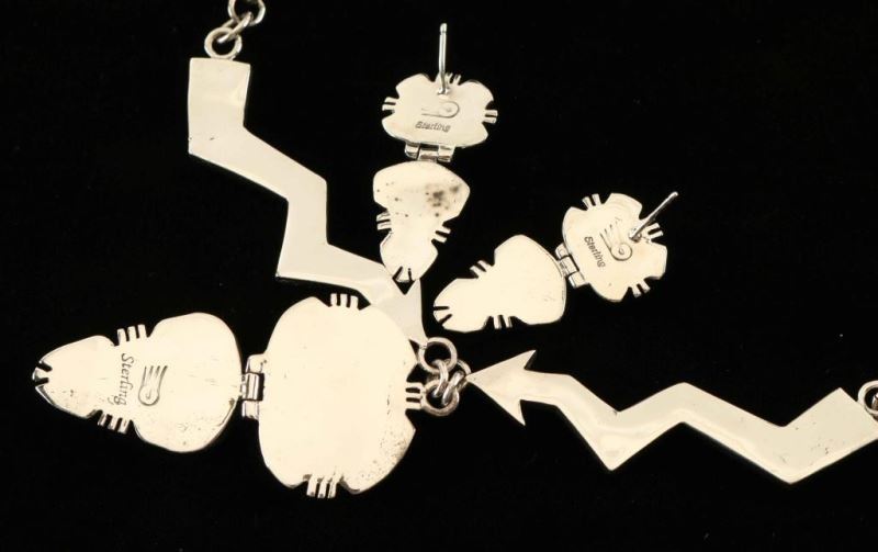 Silver lightning and arrow motif with an oval and triangle dangling center pendant set with natural howlite and lab opal. Small hand cut pieces are set into silver channels and surrounded by chiseled sterling. Measures 21" long including lobster clasp. Stamped 'Sterling' and hallmarked from Gallup, NM. Matching earrings are oval and triangle design.