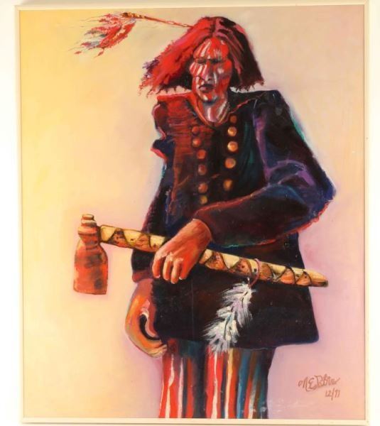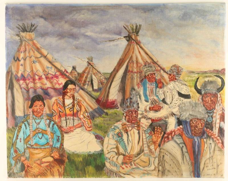 (1) Original oil on canvas of warrior with tomahawk, signed by artist lower right 12/91. Image measures 35 1/4" x 29 3/8" in off-white metal frame. (1) Acrylic on canvas board of a Plains Indian camp, unsigned. Image measures 24"x30" no frame.