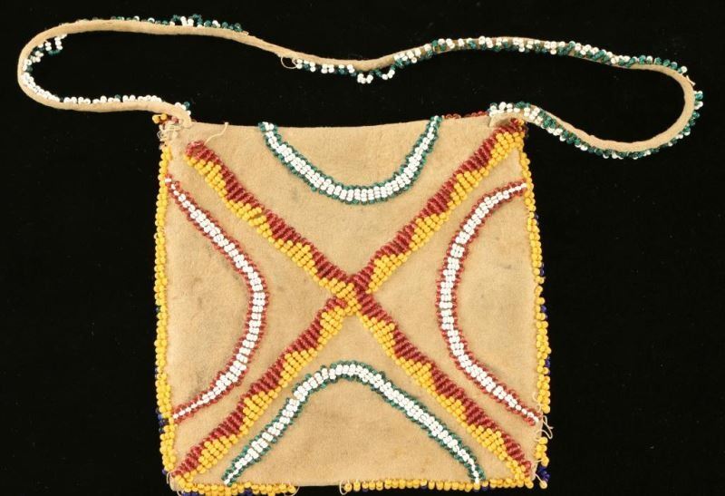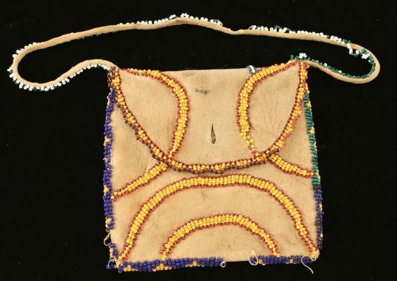 Square leather purse with beaded handle and geometric design in gold, red, green, white and blue. Designs on both side of bag. Measures 4 3/4"x5". 20th century. Scattered losses to beads and button to close flap is missing.