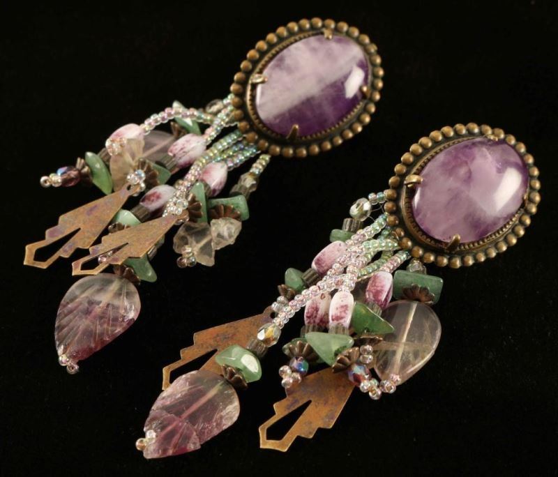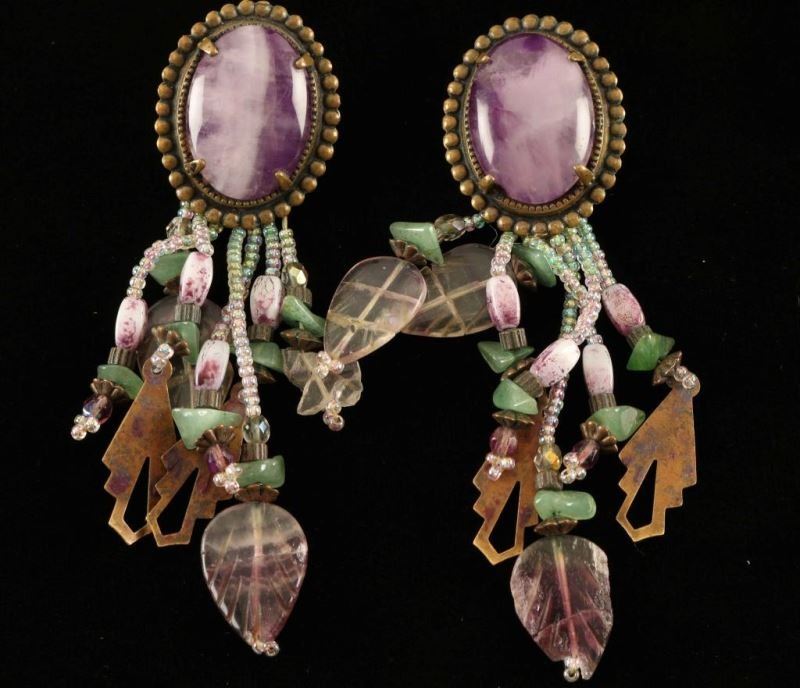 Large oval of purple amethyst with jade, amethyst, bead and brass dangles. Some of the stone dangles are cracked/broken.