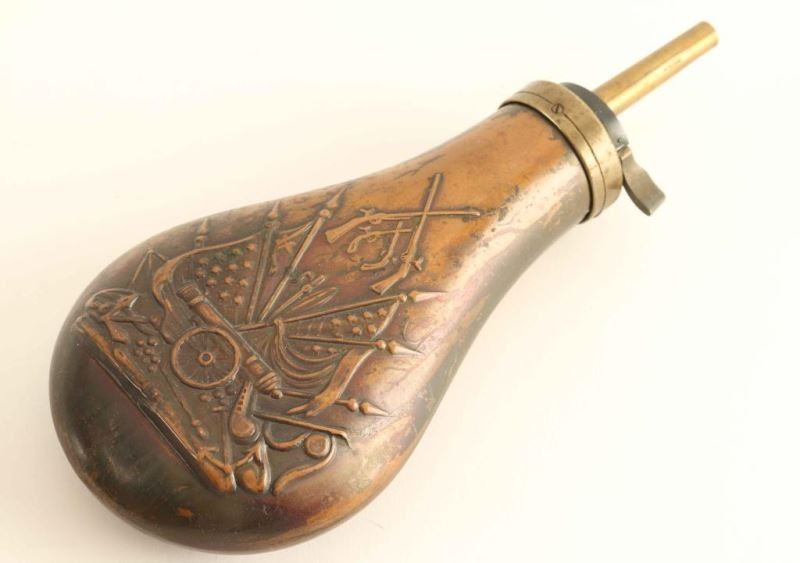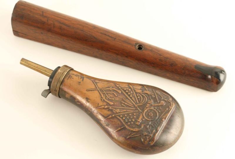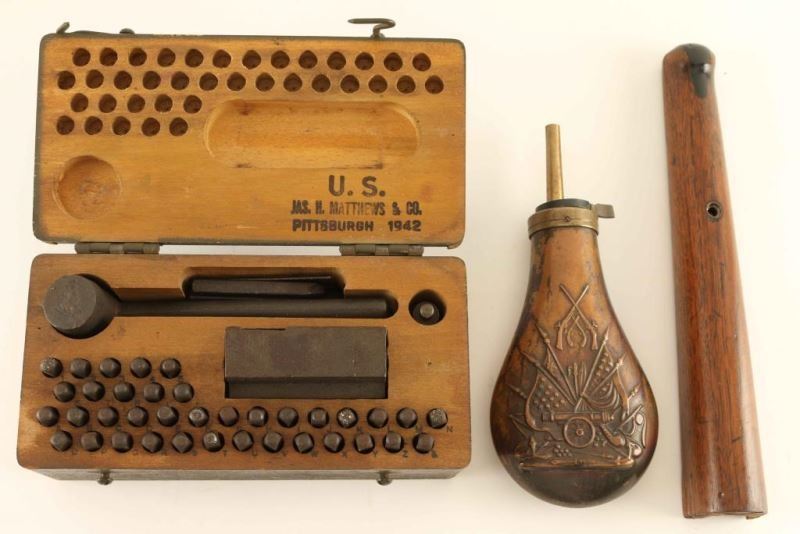 Includes a wood box labeled 'Marking Outfit for Stamping Metal' including letter and number stamps, mallet and accessories. Inside reads 'U.S. JAS. H. Matthews & Co. Pittsburgh 1942' in used condition. Also included is a metal powderhorn with flags, guns and cannon embossed on it, and a wooden forend.