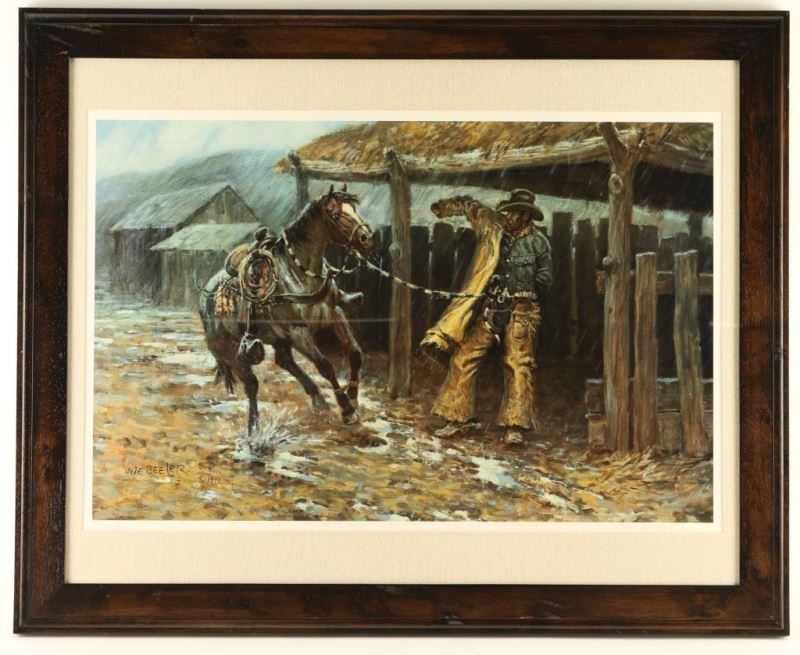 Depicting rainy stable scene with cowboy and his horse. 62/500 signed in pencil lower right. Image measures 17"x26" with mat and black wood frame. Certificate of Authenticity from the Flagstaff Festival of the Arts on back.
