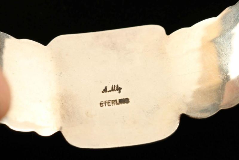 Center square of sugalite with 3 amethyst ovals on each side set in a silver stamped scallop design. Signed 'Aullety' and 'Sterling'.