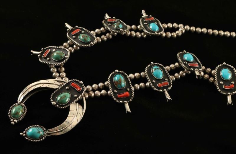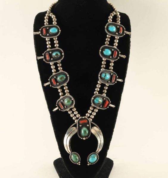 Lot 921 Turquoise & Coral Squash Blossom Necklace