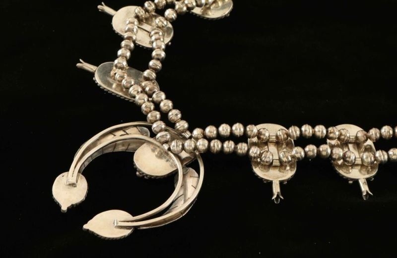 Eight ovals of sterling silver edged in a rope design hold a turquoise and coral stone with squash blossom. Silver naja with feather motif has oval of turquoise and coral with a turquoise stone at each end.