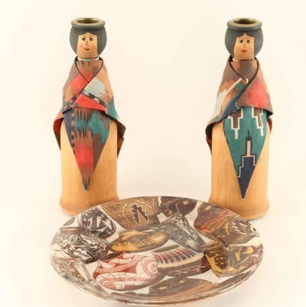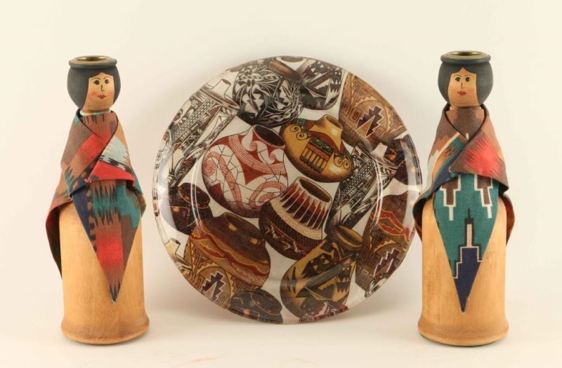 Glass plate with Native pottery design and two women in Native dress wooden candleholders.