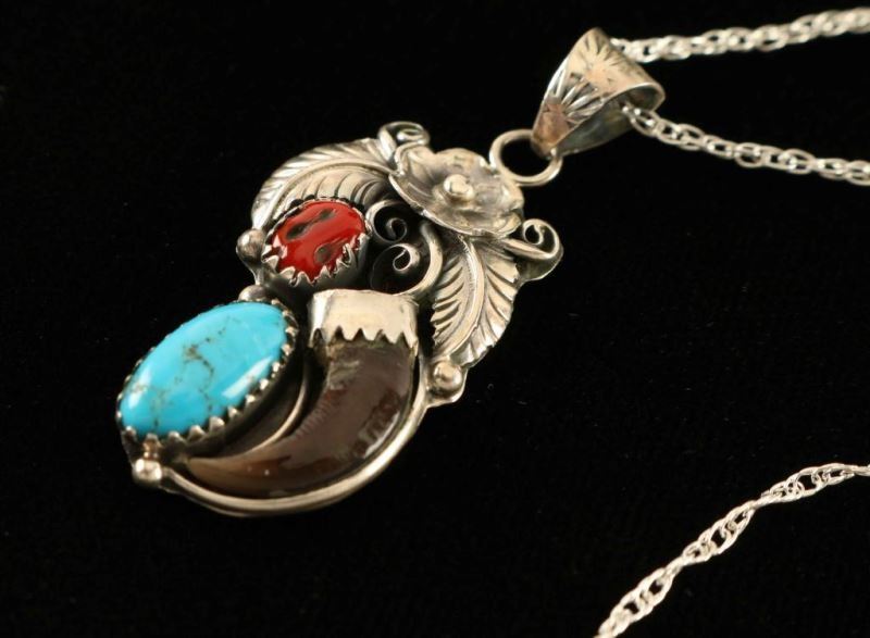 Lot 934 Silver, Coral & Turquoise Pendant with Bear Claw