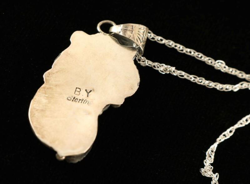 Sterling silver leaf and floral motif hold a small stone of turquoise and coral with a silver capped tiny bear claw. Marked 'BY' and 'Sterling'. Can not be sold in the state of California.