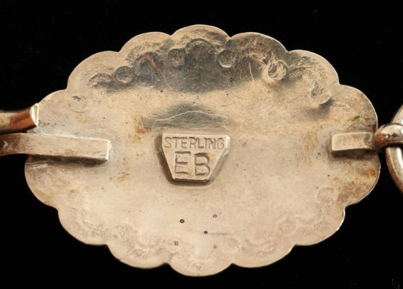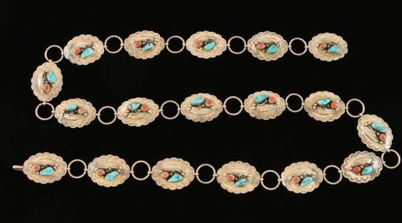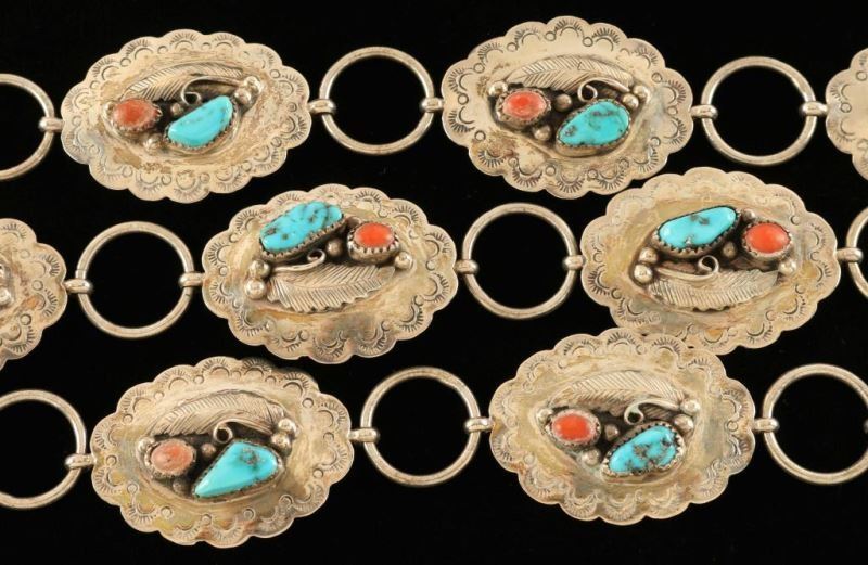 Eighteen sterling scalloped edge conchos alternate with silver rings. Each concho has a turquoise and coral stone with feather and bead design. Hook and eye closure. Marked 'EB' and 'Sterling'.