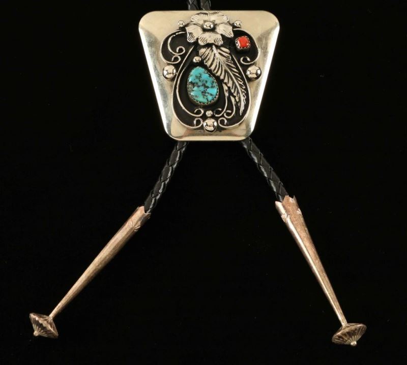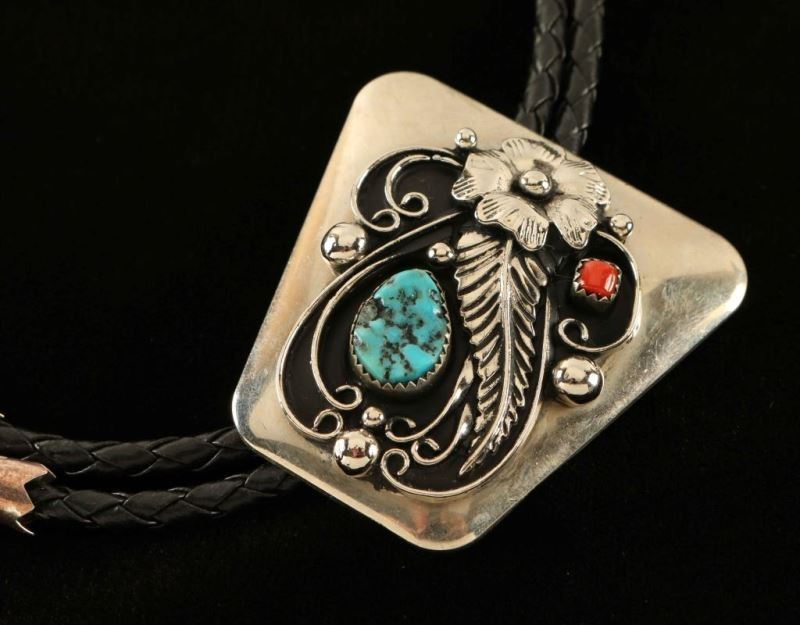 Sterling Silver with floral and feather motif hold a small coral stone and a natural turquoise stone. Comes on black braided leather with silver ends.
