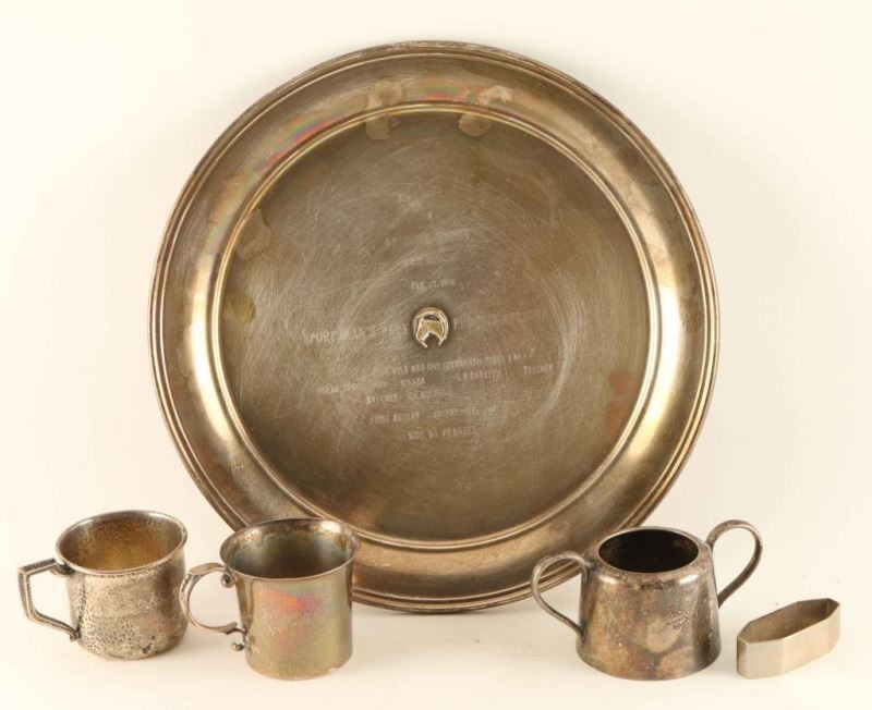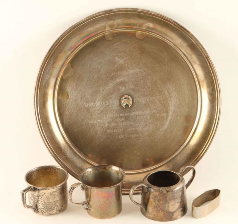 Arizona Derby Plate dated 1952 Sportsman Park Phoenix ,AZ stamped International Sterling W40-2, Monogrammed napkin ring stamped sterling 30, Mug engraved William III stamped sterling silver d5, Mug monogrammed WEJ stamped Sterling 153, and sugar doubled handled cup engraved Piccadilly stamped Caters Glasgow Appliances on base.