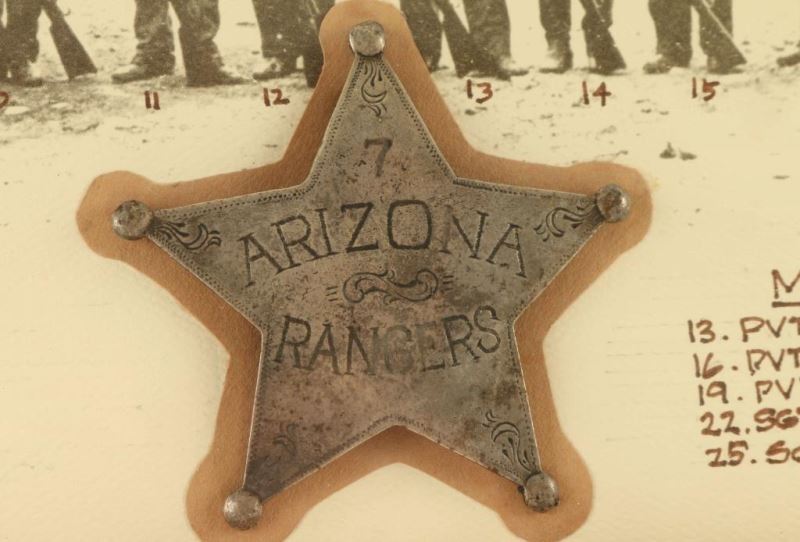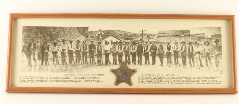 "Original Texas Rangers, Morenci, A.T. CA 1901" showing a reproduced photo of the Rangers with names listed below and an 'Arizona Rangers 7" badge mounted in the center.