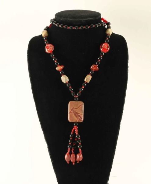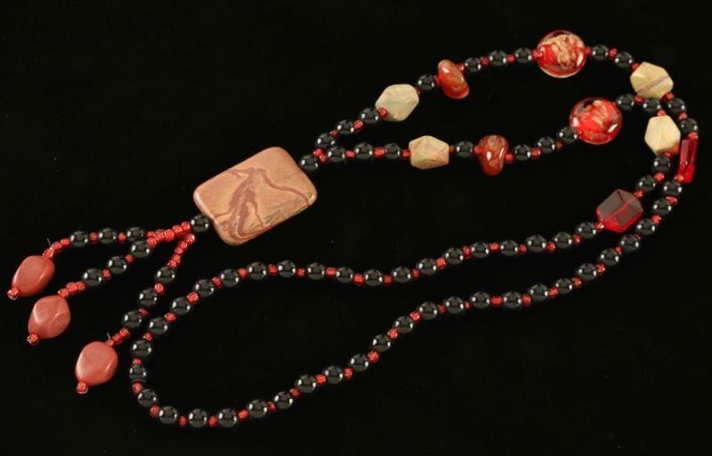 Alternating shades of black, orange and natural stone beads lead to a square of sienna and green picture jasper with three beaded dangles at the end. Measures 20" long.