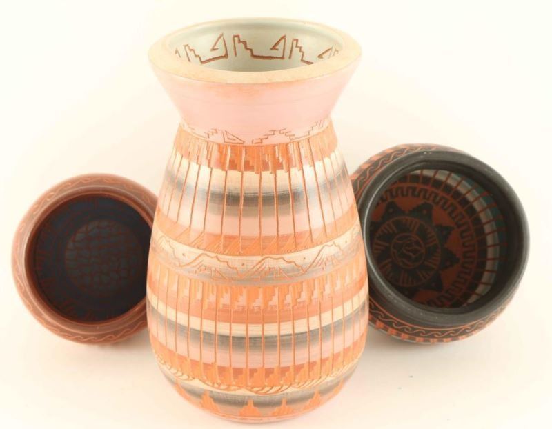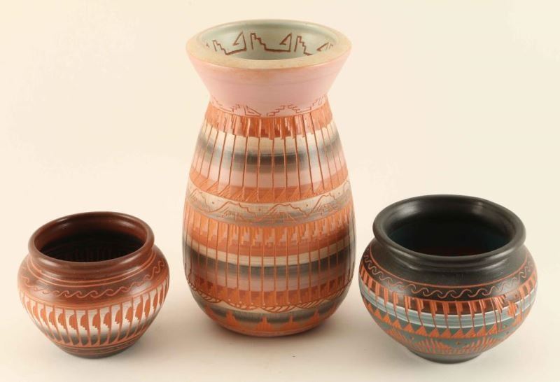Lot 961 Lot of 3 Incised Carved Pots