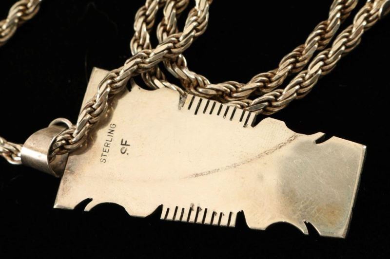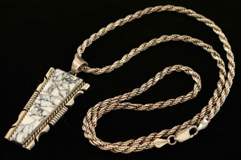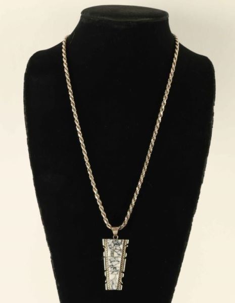Inlaid pieces of white buffalo set in a contemporary rope and traditional designed pendant marked 'SF' and 'Sterling'. Comes on an Italian rope chain marked 'Italy' and '925'.