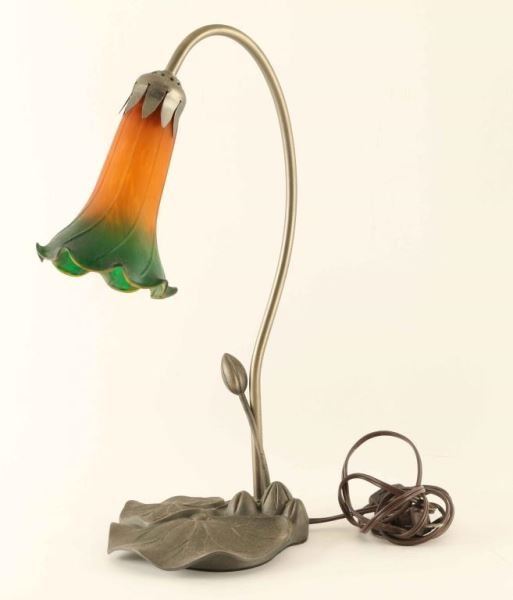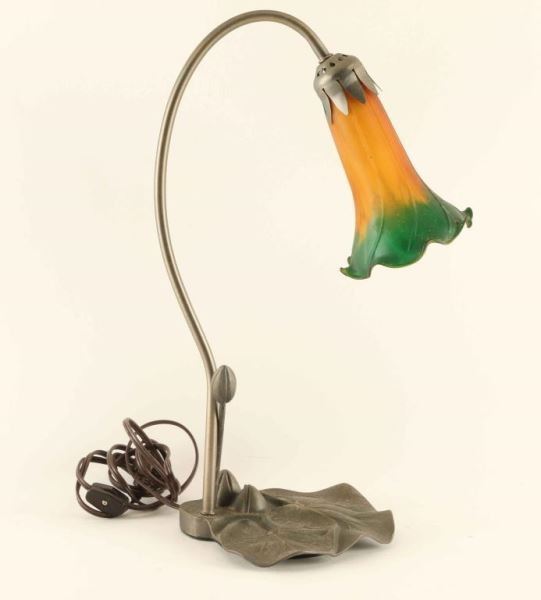 Orange and green lily hangs gracefully over a lily pad. In working condition at time of description. Measures 7"dia x 16"h.