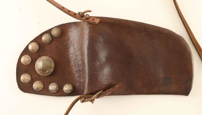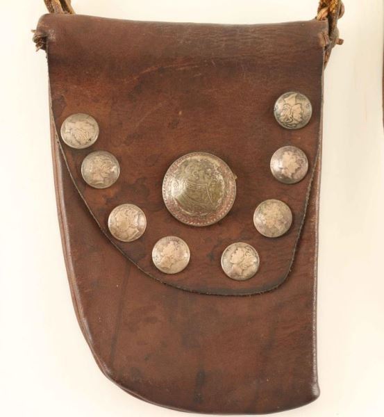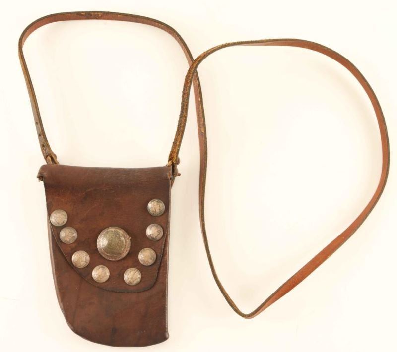Smooth brown leather with long carrying strap and eight Liberty dimes around the flap. Center coin is a 60s Peso. Measures 7"x5".