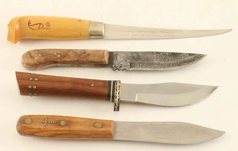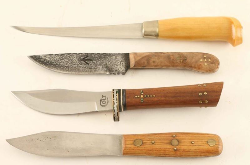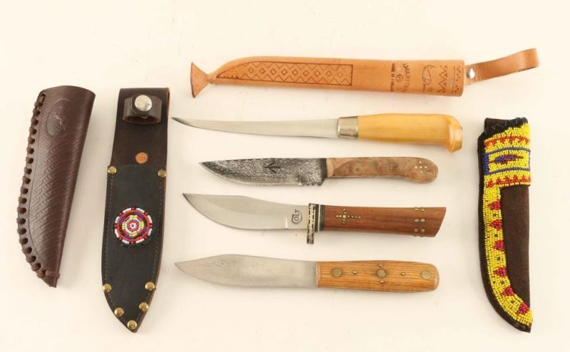 in Rapala skinner measures 11"overall with 6" blade with leather scabbard, United Cutlery wood handle measures 91/2"Overall 5" blade with beaded scabbard, Unmarked skinner measures 9"overall with 4" blade with leather beaded scabbard with cross on wood handle, and Colt knife with wood handle measures 9"overall with 4" blade with scabbard.