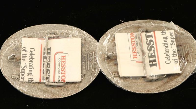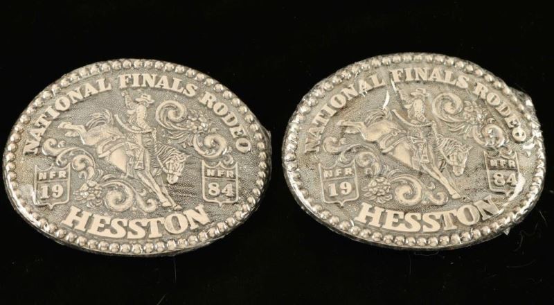'National Finals Rodeo 1984 Hesston' trophy buckles. Measure 3 3/4"x3".