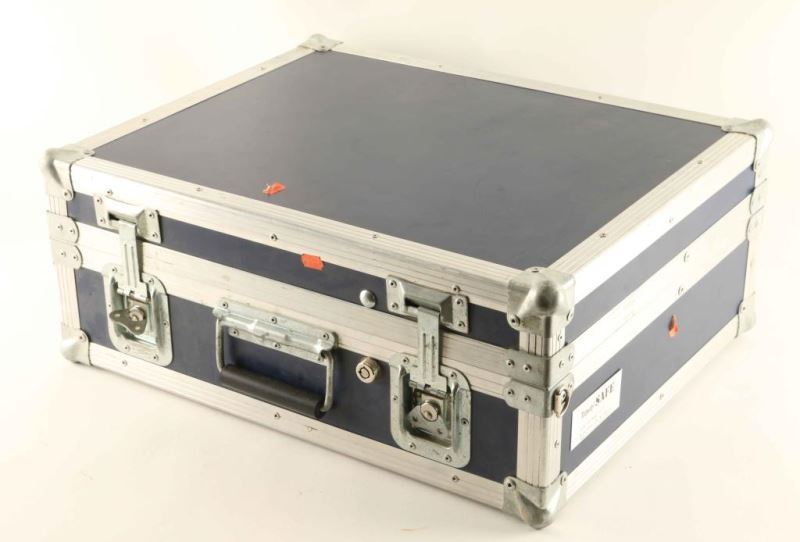 Aluminum construction TravelSafe by Dieterich & Ball Prescott, AZ. Lined with heavy duty foam. Front end of foam shows age and use. Includes key. Measures 20 1/4"x16 1/2"x8".