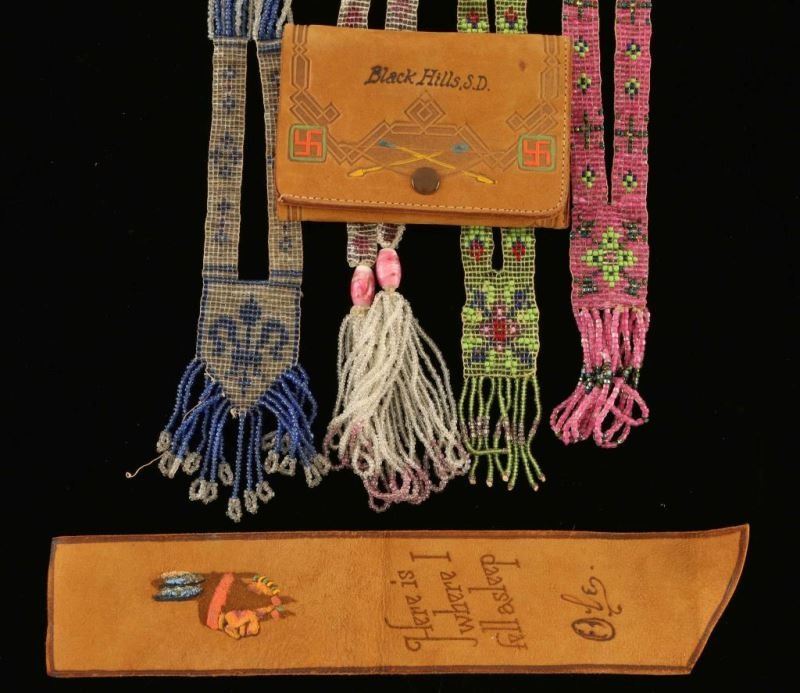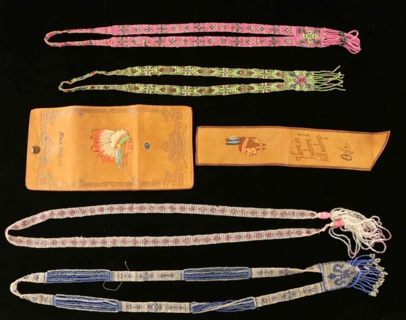 Including: (3) 20th Century Beaded Necklaces with pendants and fringe with translucent seed beads-Pink 16 1/4", Blue 18 1/4" and Green-14 3/4". (1) 20th Century Beaded Belt with translucent seed beads in pink diamond design with fringed ends. Measures 39 x 1/2". (2) Stamped leather items from the Black Hills of South Dakota-Inscribed bookmark with "Here is where I fell asleep, Ole" with Indian brave design 10"x3" and a wallet with 'Black Hills, S.D." on front flap with stamped rolling good luck symbols and arrow design with an Indian Chief on the back side. Measures 4 1/8"x3".
