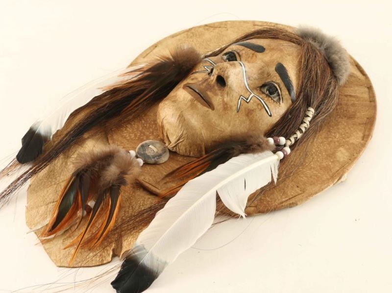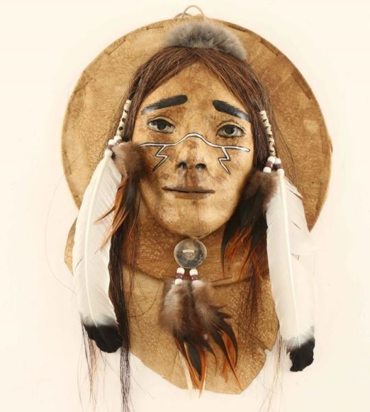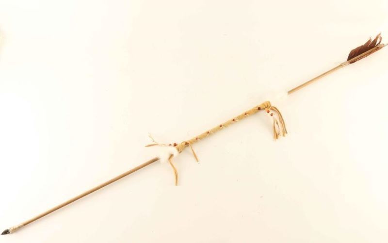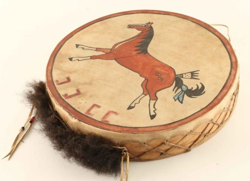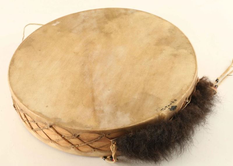 Leather Indian with horsehair, antler, fur and feather accents with glass eyes signed 'G Hand' measures 12"x19"x3 1/2", wood and rawhide drum handpainted with horse and buffalo hair accent signed 'Tatanka' from the Iron Eyes Cody Estate measures 14" dia, and a leather wrapped arrow with fur, feather and bead accents-48" long.