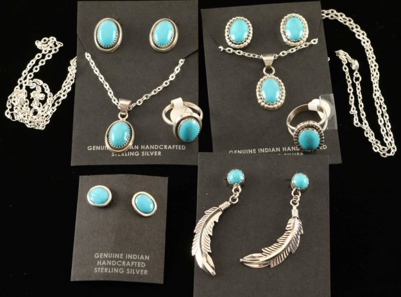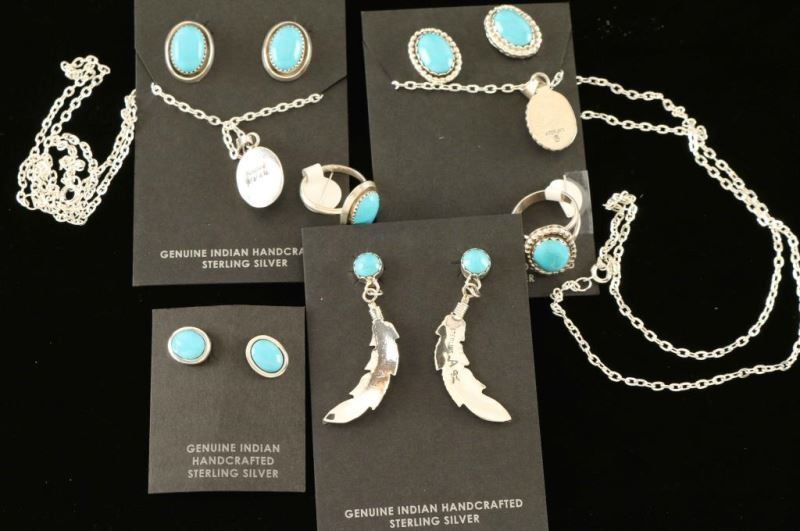 Including (2) sets with matching earrings, ring and pendant on sterling silver chains, one signed 'Marie B' the other 'S'. (1) set with oval turquoise posts set in silver with sterling and a pair of turquoise stones set with silver feather dangle earrings.