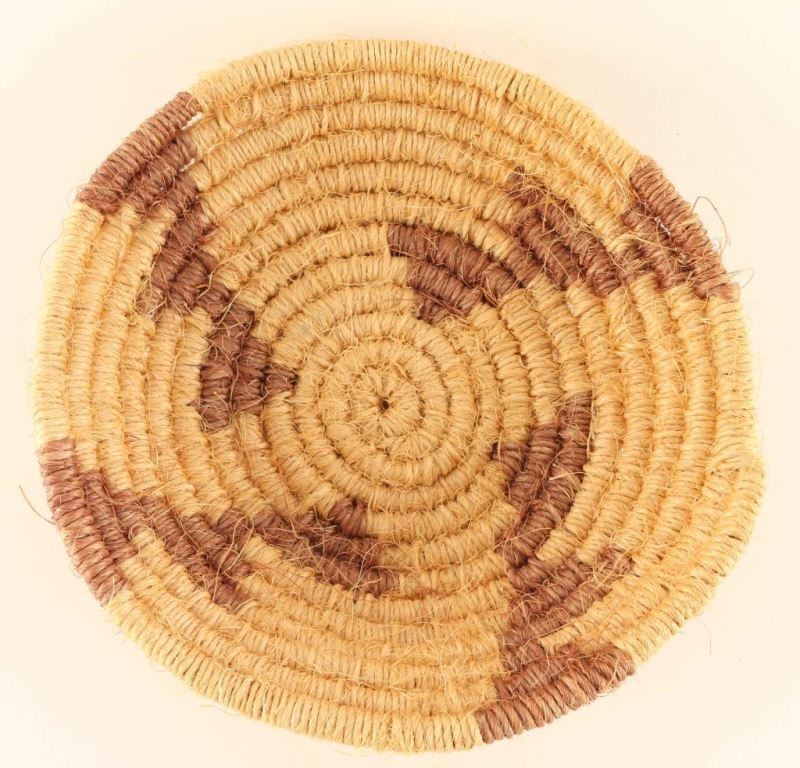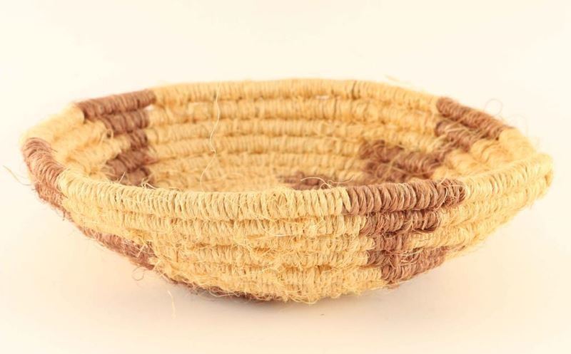 1974 single rod coiled basket in sisal with a brown geometric design. Good condition.