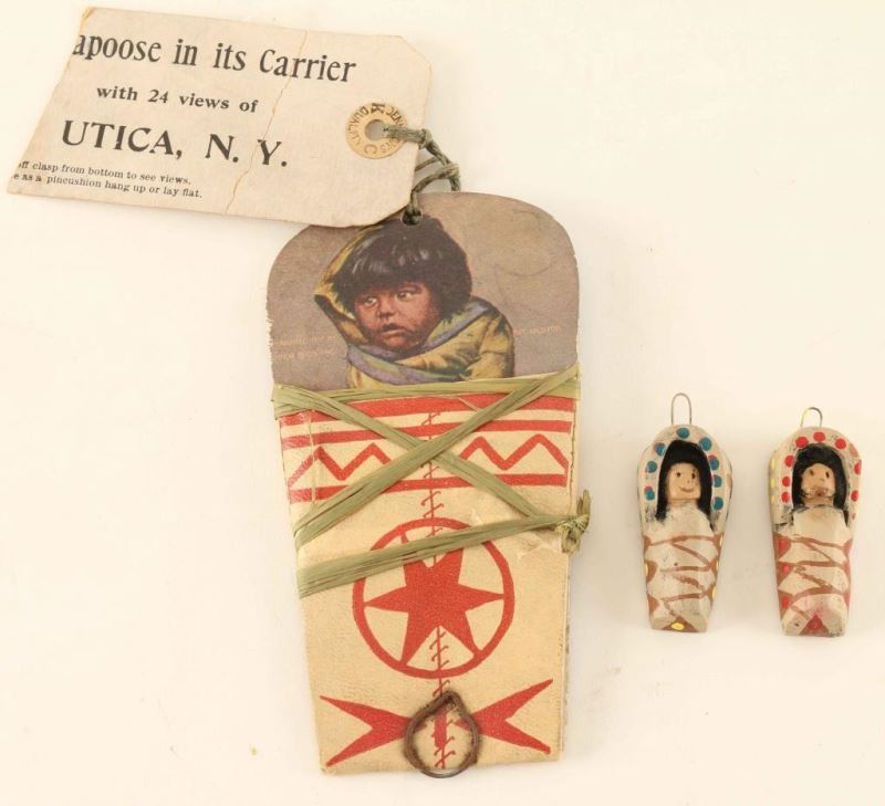 Two small handmade 'mud toy' papooses with a paper papoose in it's carrier from Utica, NY. All in a Riker mount.