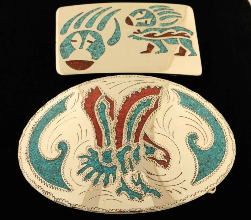 Both buckles are high quality German silver that was hand cut and overlaid to form the designs, then filled with hand crushed chips and buffed to a high shine. (1) Eagle inlaid with turquoise and coral chips in large silver oval measuring 4"x3". (1) Rectangle of silver with turquoise and coral with bear paw and bear design measures 3"x2".