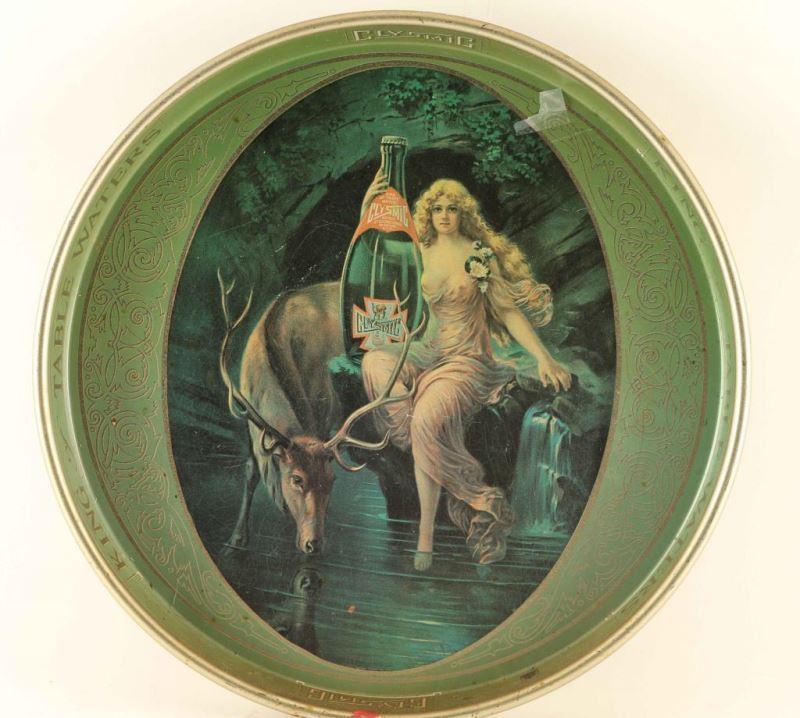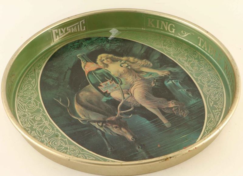 Round metal tray depicting elk drinking water with a nymph by his side holding a bottle of "Clysmic, King of Table Waters". Measures 14" dia.