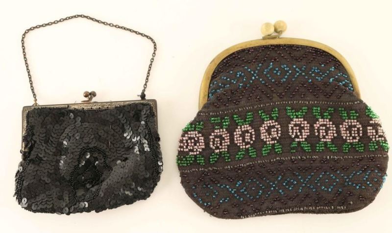 (1) Small black sequined bag with beaded floral motif. Chain handle and black silk lining. (1) Beaded black fabric with pink and green roses. Brass top with large bead snap closure.