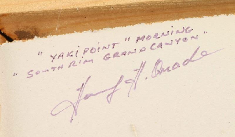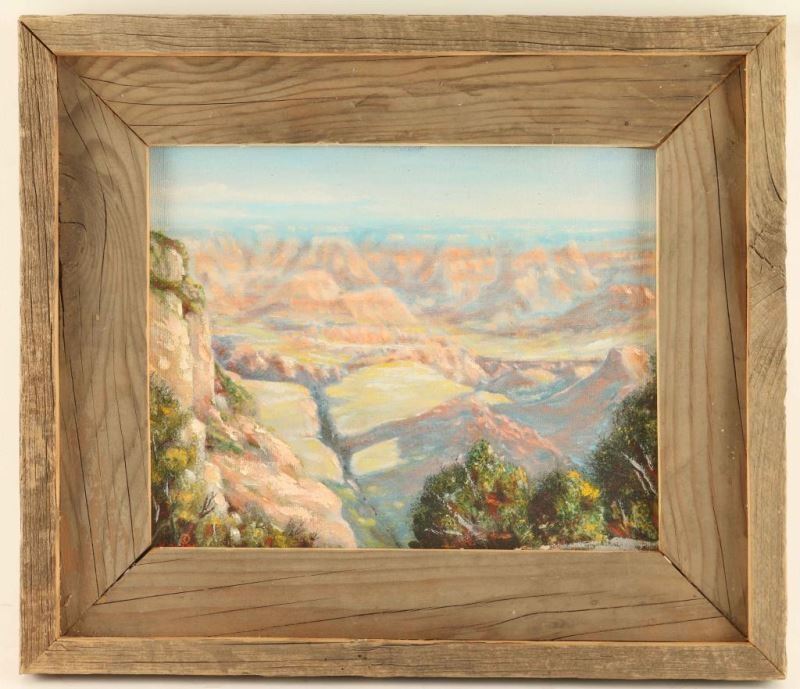 by Hardy Quade local Arizona artist. Signed lower right hand corner. Entitled "Yakipoint Morning South Rim of the Grand Canyon", measures 91/2"X71/2" in barnwood frame.