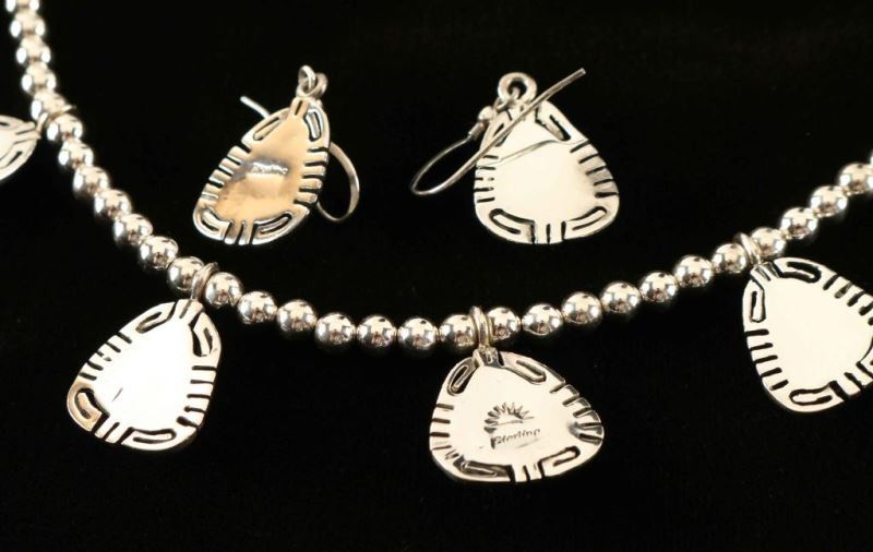 Necklace displays seven triangular shaped cabs that are bezel set in a Hopi style border pattern. The average measurement is 3/4" tall x 5/8" wide and all are strung on a 5mm sterling desert pearl choke with lobster claw clasp. Measures 18" long and stamped 'Sterling' and hallmarked. Comes with matching earrings on French hooks.